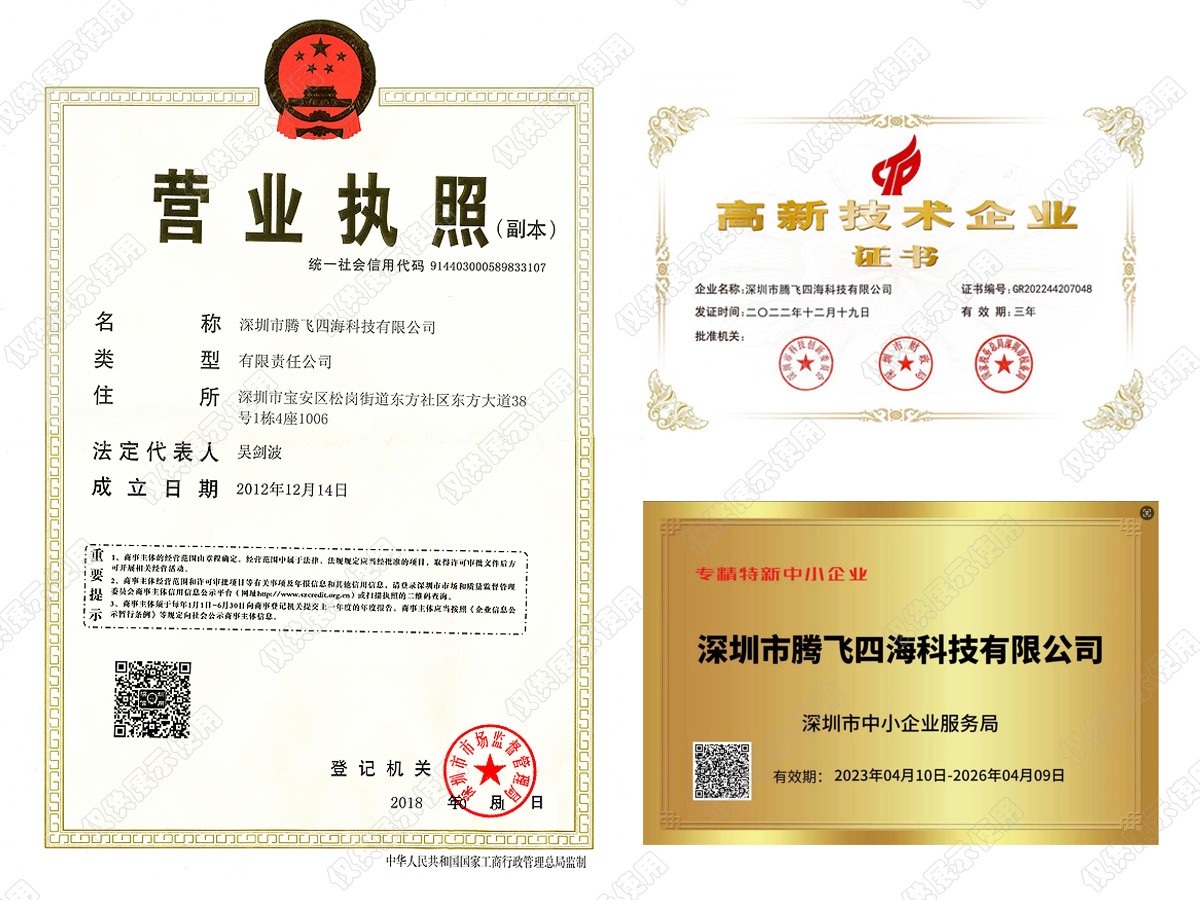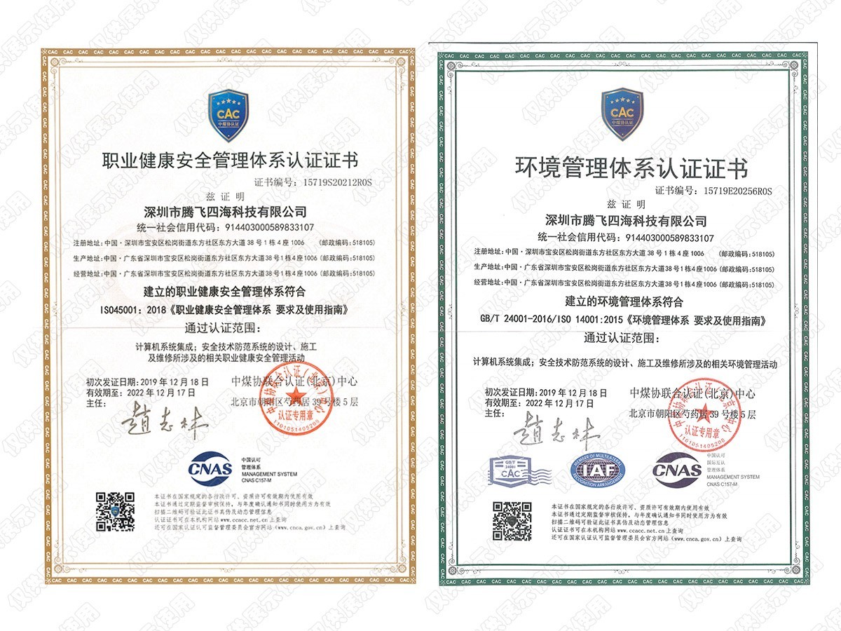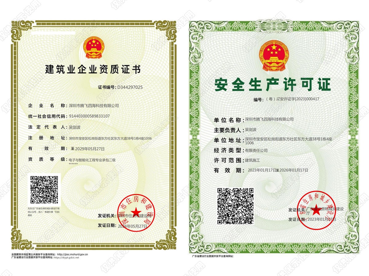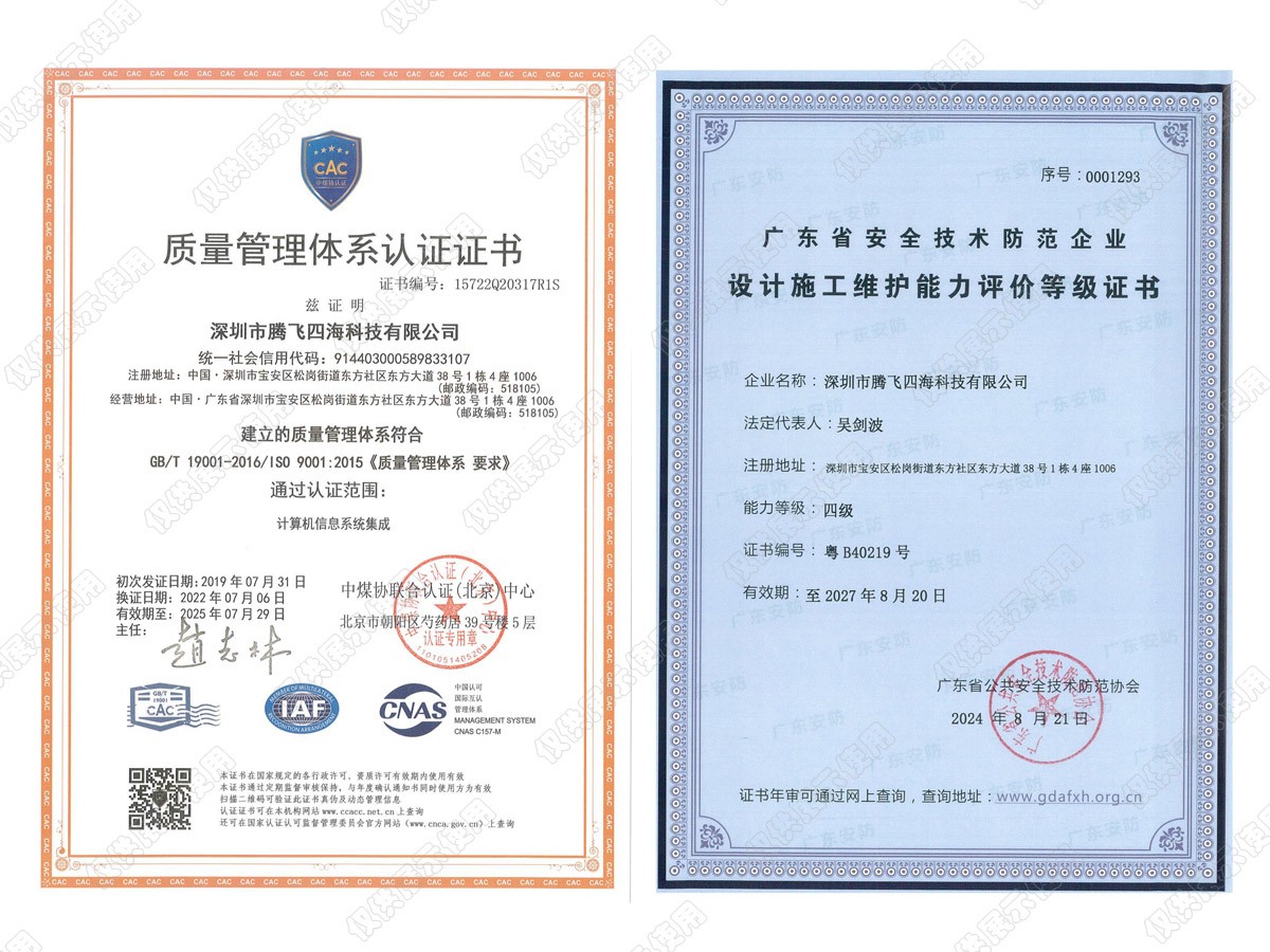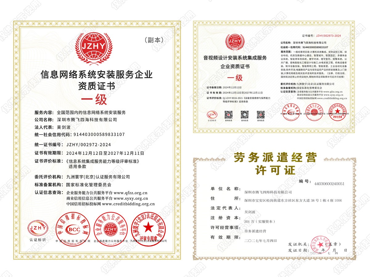 深圳市騰飛四??萍加邢薰緦WF(xiàn)代化企業(yè)信息建設,爭做國內(nèi)互聯(lián)網(wǎng)與安防領域的領導者。作為一家擁有自主知識產(chǎn)權的國家高新技術企業(yè),在成立之初便堅持從用戶的實際需求出發(fā),以質(zhì)量求發(fā)展,以信譽求生存。歷經(jīng)15年的風雨路程,如今,我們已榮獲電子與智能化專業(yè)承包資質(zhì)、廣東省公安廳安防資質(zhì)、安全生產(chǎn)許可證資質(zhì)、計算機信息系統(tǒng)集成等多項資質(zhì)。截止目前公司已通過:ISO9001質(zhì)量管理體系認證,ISO14001環(huán)境管理體系和ISO45001職業(yè)健康安全管理體系;榮獲AAA資信認證、實用新型專利證書、計算機軟件著作權登記證書。公司現(xiàn)為深圳市安防協(xié)會理事單位,深圳市文明誠信企業(yè),廣東省“守合同重信用”企業(yè)、深圳市政府采購中心供應商等多個榮譽證書。